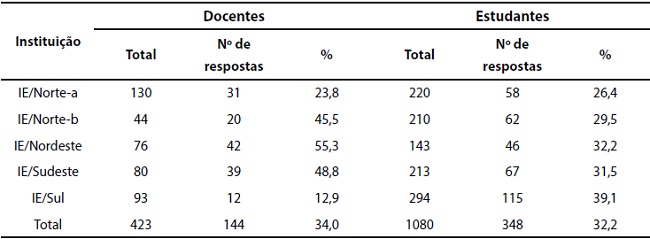 Em relação à categoria ‘docentes’, de uma população de 423 sujeitos, obtivemos uma amostra composta por 144 deles (34% do total). Quanto à categoria ‘estudantes’, de uma população de 1.080 sujeitos matriculados em cursos técnicos ofertados pelas instituições investigadas e aptos a fazer estágio supervisionado, obtivemos uma amostra de 348 deles (32,2% do total), conforme explicitado na Tabela 1. Estas amostras foram constituídas por aqueles que atenderam ao pedido de preenchimento de formulário eletrônico do Google Drive enviado por e-mail a toda a população investigada. Estes questionários ficaram disponíveis para preenchimento durante o período de 02/09/2013 a 24/01/2014, no caso dos docentes; e de 18/11/2013 a 08/08/2014, no caso dos estudantes. Em ambos os casos, tratam-se de amostras probabilísticas, pois cada um dos sujeitos de ambas as categorias que compõem a população investigada teve igual probabilidade de compor a amostra. Em outro aspecto, tratam-se também de amostras casuais simples, pois cada segmento investigado teve oportunidade igual de seus membros serem incluídos na amostra.