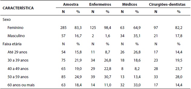 Foram entrevistados 342 trabalhadores: enfermeiros (n=127), médicos (n=97) e cirurgiões-dentistas (n=118) da ESF. A amostra apresentou-se composta predominantemente pelo sexo feminino (83,3%) e com média de idade de 45,8 anos (dp=13,6), concentrados na faixa etária de quarenta anos ou mais (62,3%). Essas características podem ser observadas na Tabela 1 .