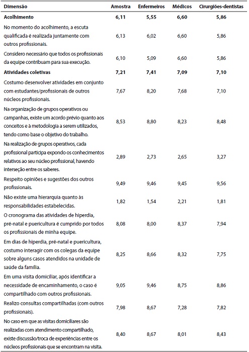 Na análise do questionário, a dimensão ‘acolhimento’ obteve a média mais baixa (6,1); logo, foi classificada como ‘média prática interdisciplinar’. As dimensões ‘atividades coletivas’ (7,4), ‘disponibilidade de tempo’ (7,8), ‘planejamento’ (7,9), ‘atividades individuais’ (8,3), ‘comunicação’ (8,6) e ‘atitude’ (9,6) tiveram suas práticas classificadas como ‘forte interdisciplinaridade’. Nenhuma dimensão foi classificada como ‘fraca interdisciplinaridade’. A análise desses resultados, isoladamente, indica que a percepção dos sujeitos do estudo quanto à integração no nível dos saberes (interdisciplinar) e das práticas (interprofissional) na Estratégia Saúde da Família foi positiva, uma vez que mais de 90% das variáveis investigadas apresentaram médias superiores a sete, e estatisticamente os grupos não apresentaram diferenças entre si.