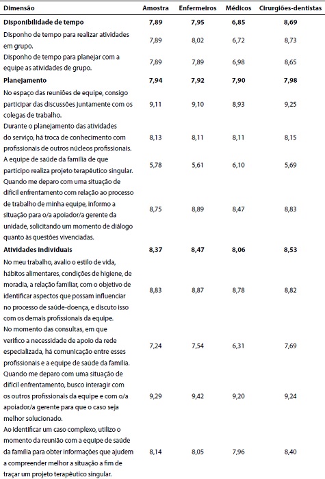 Ao se avaliar isoladamente a assertiva, notaram-se médias significativamente baixas das respostas obtidas, o que implica dizer que as três classes profissionais avaliadas pouco realizavam ou não realizavam o PTS. No entanto, em um quesito posterior, os mesmos profissionais deram notas altas à afirmativa que dizia que, ao identificar um caso complexo, eles utilizam o momento da reunião com a equipe de saúde da família para obter informações que ajudem a compreender melhor a situação a fim de traçar um PTS, discordando do que havia sido dito antes. Essas inversões de respostas podem se justificar devido ao longo questionário aplicado aos profissionais que, muitas vezes, dispersos pela ansiedade de responder rapidamente às questões, perdem a atenção e lançam falsas respostas, conforme descrito por De Britto Júnior e Feres Júnior (2011) . Essa explicação pode ter gerado escores altos para a dimensão ‘planejamento’.