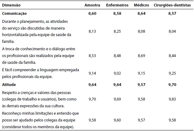 O estudo demonstrou que as dimensões dependentes da postura do profissional de forma isolada ( Tabelas 3 e 4 ) e que não envolviam interações com o colega (atividades individuais, comunicação e atitude) foram as que tiveram as maiores médias, consideradas pelos profissionais como práticas fortemente exercidas no dia a dia do seu trabalho. Esse achado denunciou a tendência de trabalho uniprofissional nessas equipes.
