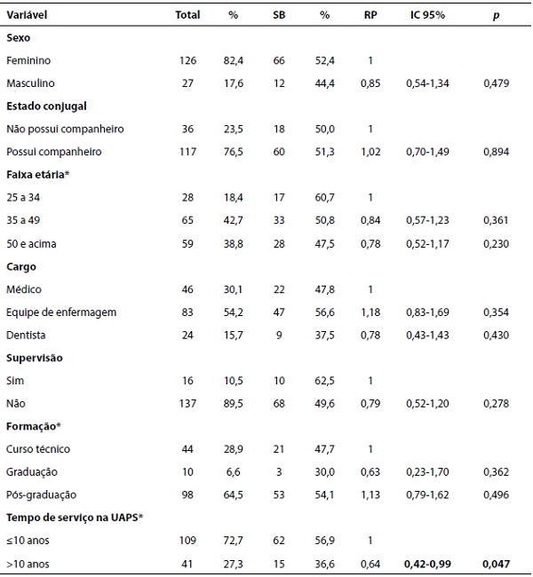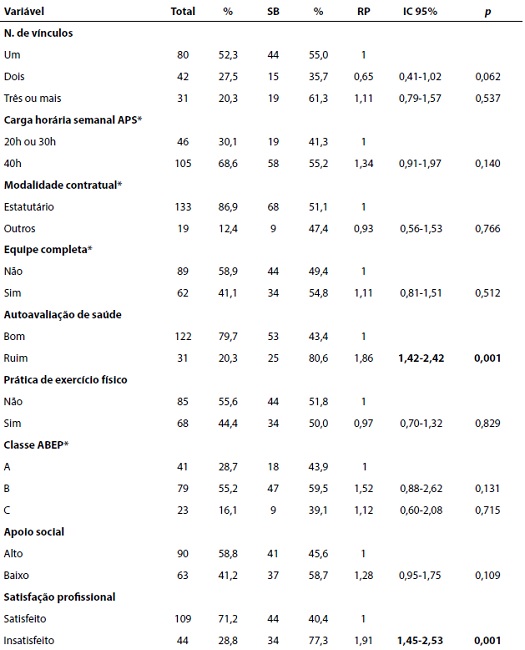Verificou-se que os profissionais que relataram trabalhar na UAPS há mais de dez anos apresentaram uma probabilidade de SB 36% menor do que os que trabalhavam há menos tempo (RP=0,64; IC95% 0,42-0,99), enquanto aqueles que autoavaliaram negativamente suas condições de saúde (RP=1,86; IC95% 1,42-2,42) e referiram-se insatisfeitos no trabalho (RP=1,91; IC95% 1,45-2,53) apresentaram maior prevalência de SB.