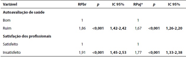A análise multivariada, realizada por meio de regressão de Poisson robusta, controlada por faixa etária e sexo, mostrou que os fatores associados significativamente à SB ( Tabela 2 ) foram a autoavaliação do estado de saúde ruim (RP=1,67; IC95% 1,26-2,20) e insatisfação profissional (RP=1,77; IC95% 1,33-2,38).