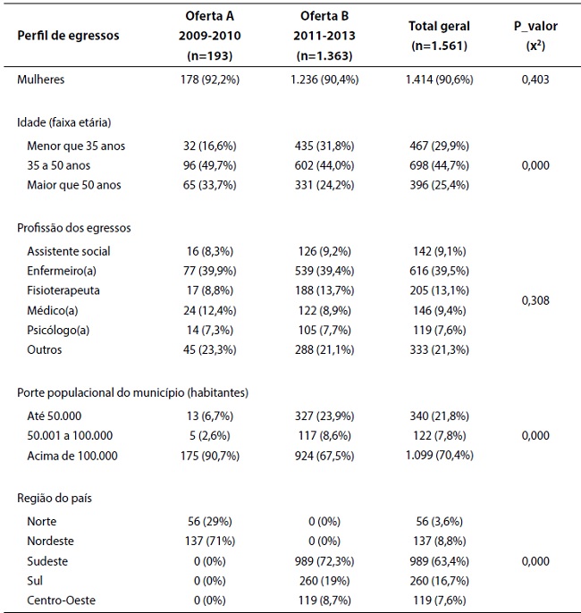 Na Tabela 1, é apresentado o perfil de 1.561 egressos do curso obtido na base Simios, segundo as ofertas do curso.