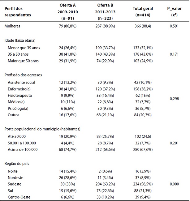 Na Tabela 2 é apresentado o perfil dos 414 respondentes. De forma convergente com o perfil geral dos egressos do curso, houve importante predominância do sexo feminino tanto na oferta A quanto na B, respectivamente 86,8% e 88,9%. Da mesma forma, tem-se predominância de profissionais de enfermagem, cerca de 38%, assim como de profissionais com idade entre 35 e 50 anos em ambas as ofertas (41,8% e 43,3%), sem diferença significativa entre elas.