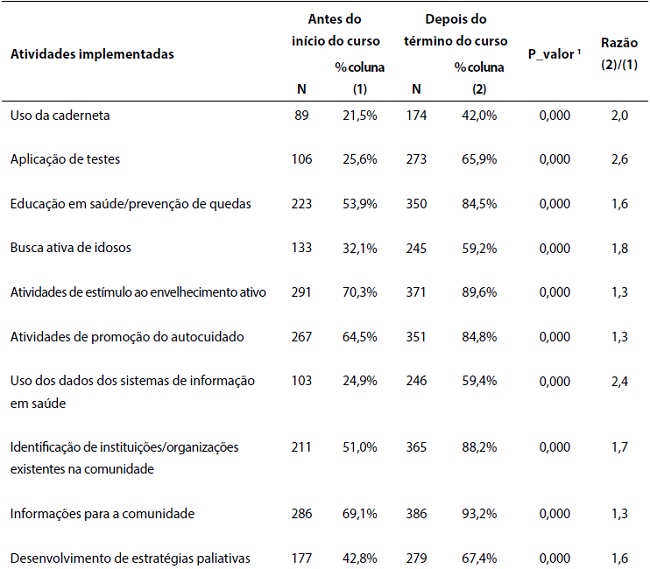 Na Tabela 3, apresenta-se a declaração dos entrevistados quanto à realização das atividades previstas para atendimento à população idosa na atenção básica, de acordo com as diretrizes da PNSPI e do Pacto pela Vida, em dois momentos distintos: antes do início e depois do término do curso. Encontraram-se diferenças significativas na proporção de egressos que não realizavam as atividades e passaram a realizá-las após o curso. Esse comportamento foi verificado para todas as atividades investigadas, com a proporção de implementação melhorando de 1,3 a 2,6 vezes, e as atividades ‘uso da caderneta’, ‘aplicação de testes’ e ‘uso dos dados dos sistemas de informação em saúde’ tiveram melhora de pelo menos duas vezes mais, quando comparados os dois períodos. Por exemplo, a atividade ‘uso dos dados dos sistemas de informação em saúde’ mudou de 25% para cerca de 60% de egressos passando a realizá-la.