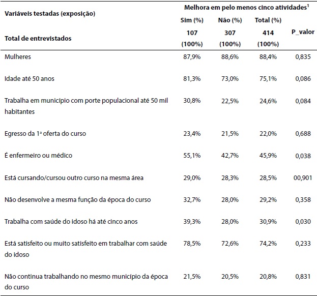 A variável-desfecho para medir o impacto do curso foi expressa por meio da melhora no desempenho dos profissionais egressos em pelo menos cinco de dez atividades relacionadas à saúde do idoso previstas na PNSPI (‘ter melhora’), que representou cerca de 25% dos egressos, correspondendo ao terceiro quartil da variável ‘número de atividades4 com melhora’.