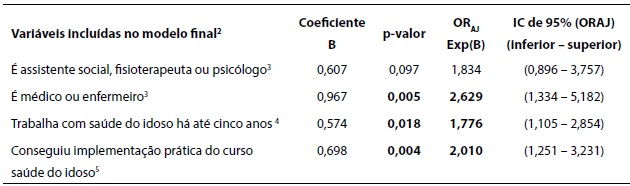 Na abordagem multivariada (Tabela 5), as variáveis que tiveram maior influência significativa na melhora do desempenho (p<10%) foram: profissão (ser assistente social, fisioterapeuta ou psicólogo [OR=1,834; p=0,097] e ser médico ou enfermeiro [OR=2,629; p=0,005], em comparação com outras profissões); tempo que trabalha com saúde do idoso (SI) tendo como referência mais de cinco anos de atuação com essa clientela (OR=1,776; p=0,018); e a implementação prática do curso quando comparada a sua não implementação (OR=2,010; p=0,004).
