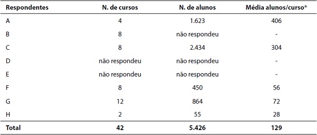 A Tabela 1 apresenta os dados referentes ao número de cursos e de alunos das oito instituições pesquisadas, segundo os participantes do estudo.