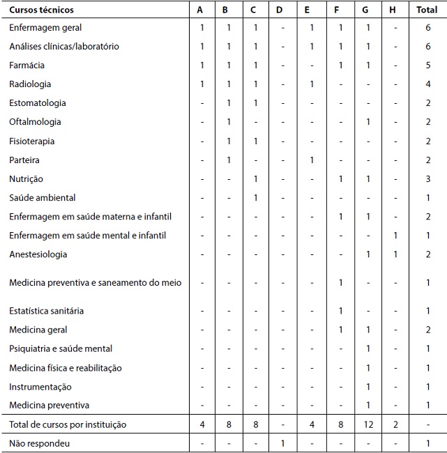 A maior parte dos 46 cursos informados se concentrava em enfermagem geral (13,04%), análises clínicas/laboratório (13,04%), farmácia (10,87%) e radiologia (8,69%), totalizando 45,64% das respostas apresentadas pelos pesquisados. Os demais 25 cursos representavam 54,36% do total de respostas apresentadas pelos pesquisados.