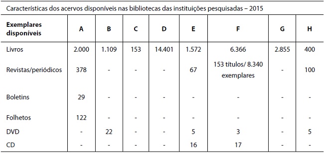 O acervo disponível nas instituições pesquisadas revelou disparidade significativa em relação aos tipos e quantidades de materiais, conforme apresentado na Tabela 3.