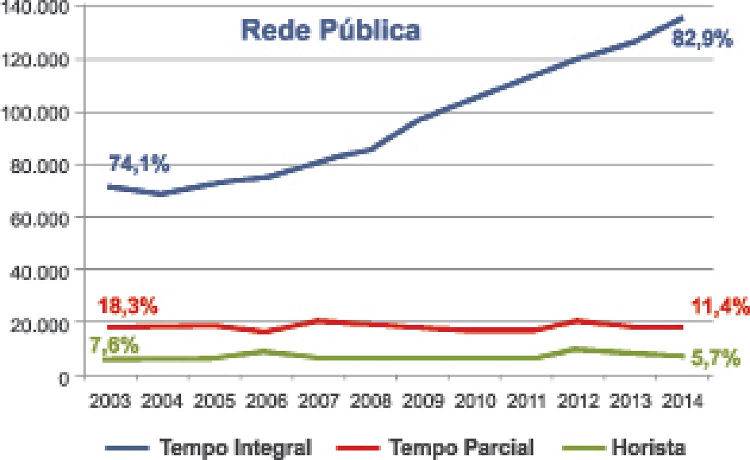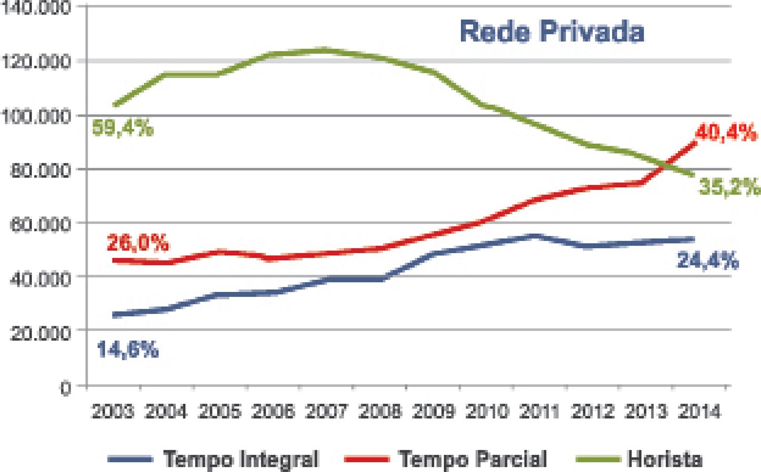 Ao observar a trajetória histórica da constituição do trabalho docente no Brasil, compreende-se a massificação do ensino como consequência da chamada democratização do ensino superior: entre 2003 e 2014, houve aumento de 96,5% na matrícula nesse nível. Diferenças entre a rede pública e privada de ensino são sensíveis: 82,9% dos docentes da rede pública têm doutorado e atuam em regime de trabalho de tempo integral, enquanto 11,4% atuam em tempo parcial e 5,7% são horistas (ver Gráfico 1). Já na rede privada, conforme se observa no Gráfico 2, o mestrado é o grau de formação mais frequente e o regime de trabalho prioritário é o parcial, com 40,4 % dos docentes, frente a 24,4% em tempo integral e 35,2% de horistas. Em 2014 havia 383.386 funções docentes em exercício na educação superior no Brasil, dos quais 57,5% tinham vínculo com IES privada e 42,5% com IES pública (INEP, 2015).