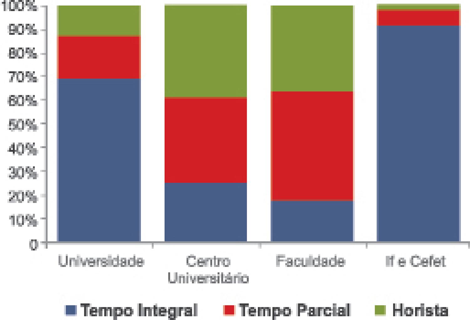 Outro ponto que evidencia diferenças no trabalho docente é a distribuição de regimes de trabalho por tipo de IES, como ilustra o Gráfico 3.