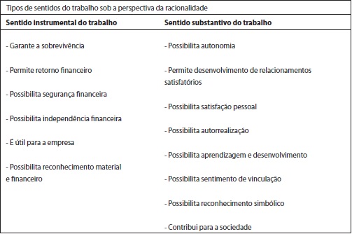 Andrade, Tolfo e Dellagnelo (2012) partem do pressuposto de que os sentidos atribuídos ao trabalho estão relacionados a duas racionalidades presentes na sociedade e nas organizações: a instrumental e a substantiva. Os autores tomam como base a pesquisa de Serva (1997) , que elencou como elementos constitutivos da ação racional instrumental a projeção utilitária das ações das pessoas, objetiva os fins, o aumento de poder, a maximização dos recursos, o êxito, o desempenho, a utilidade, a rentabilidade e a estratégia interpessoal (influência planejada sobre outrem); já como elementos da ação racional substantiva estão a busca pela autorrealização, o entendimento (ações pelas quais se estabelecem acordos e consensos racionais), o julgamento ético, a autenticidade (integridade, honestidade e franqueza dos indivíduos nas interações), os valores emancipatórios (direcionados para o bem-estar coletivo) e a autonomia. A diferença entre os sentidos do trabalho segundo a visão das racionalidades instrumental e subjetiva fica evidenciada no Quadro 1 .