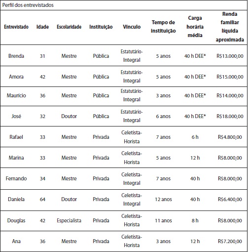 Dez docentes com o perfil previamente delineado foram convidados e aceitaram participar da entrevista. Foram informados quanto aos objetivos da pesquisa e à garantia de sigilo em relação a suas identidades. As características dos participantes são apresentadas na Quadro 2 , na qual se adotam nomes fictícios.