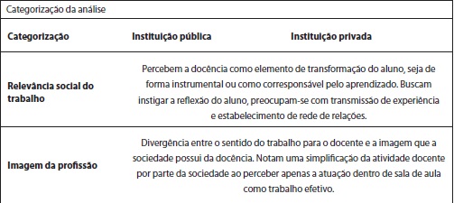 Para a análise, foi efetuada a tabulação dos dados em tabela Excel® única, com o objetivo de efetuar a categorização dos dados coletados a posteriori bem como a identificação das unidades de sentido para efetivação de análise de conteúdo ( Bardin, 2000 ). Assim, as categorias encontradas foram: relevância social do trabalho; imagem da profissão; sentimento de vinculação com o trabalho; sentimento de pertença a uma classe trabalhadora; e flexibilização do trabalho e relação entre vida pessoal e profissional.