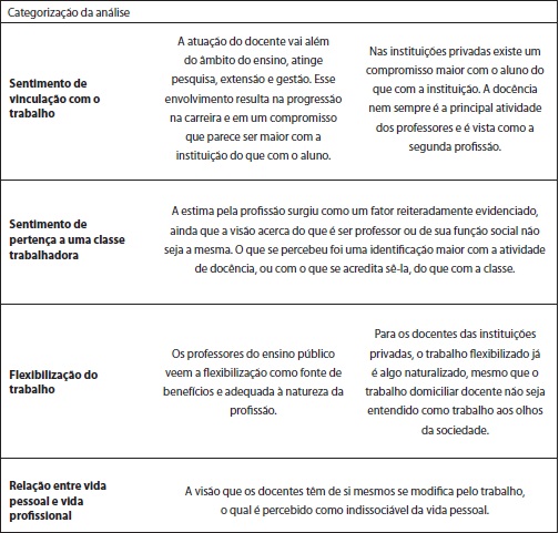 Os dados são agrupados conforme categorização efetuada ( Quadro 3 ) e discutidos de acordo com as especificidades entre as redes de ensino. As maiores diferenciações entre as redes foram identificadas nas categorias relacionadas ao sentimento de vinculação e à flexibilização do trabalho.