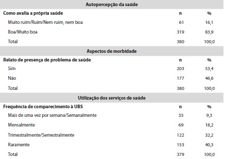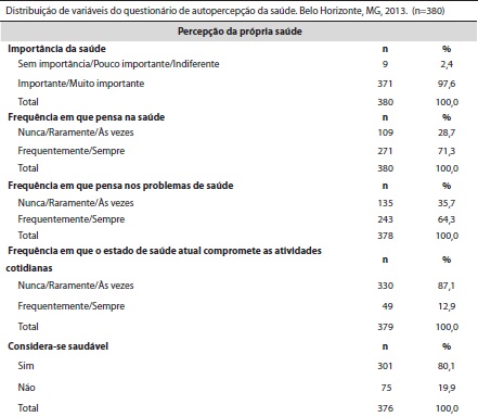 As variáveis acerca da autopercepção de saúde foram avaliadas por meio do questionário de autopercepção da saúde. O instrumento foi elaborado pelas autoras e composto por eixos temáticos: percepção da própria saúde (importância atribuída à saúde, frequência na qual o participante pensa na própria saúde e nos problemas de saúde; percepção de comprometimento das atividades cotidianas devido ao estado de saúde atual; percepção de si como pessoa saudável); autopercepção da saúde (pergunta ‘Como você avalia a sua saúde?’, com resposta em escala Likert de cinco pontos – atribuição de uma nota para a própria saúde, em escore de zero a dez, em números inteiros, sendo zero referente a saúde muito ruim e dez, a excelente); aspectos de morbidade (presença e número de problemas de saúde, segundo o relato dos participantes) e utilização dos serviços de saúde (motivo de ter ido à UBS no dia da entrevista, frequência de comparecimento à UBS e tempo decorrido desde o último comparecimento).