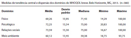 A Tabela 2 apresenta as medidas de tendência central e dispersão dos domínios do WHOQOL. Observou-se que os domínios psicológico e relações sociais foram os que apresentaram as maiores médias (respectivamente, 72,25 e 73,59). Estes achados indicaram melhor qualidade de vida dos entrevistados em relação a esses domínios quando comparados ao físico e ao meio ambiente, ambos com escores médios inferiores a 70,00.