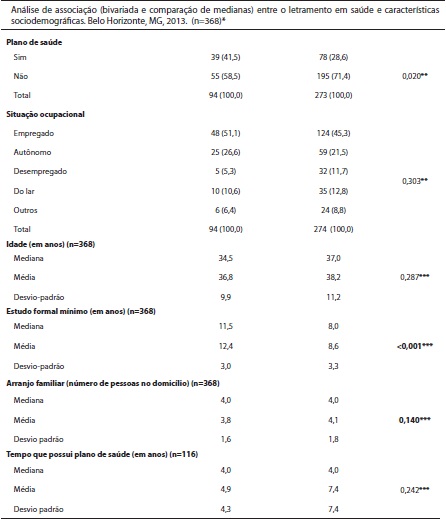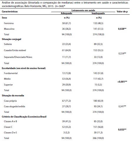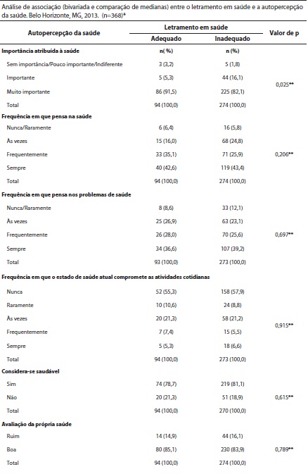 A análise bivariada foi realizada com os 368 participantes que responderam ao instrumento de avaliação do letramento em saúde (SAHLPA-18) de forma completa.