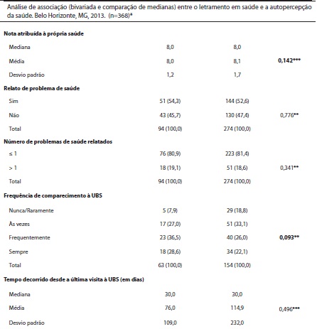 Na Tabela 4 , verifica-se a análise de associação (bivariada e comparação de medianas) entre o letramento em saúde e a autopercepção da saúde. Foram observadas associações, ao nível de 20% (p ≤ 0,20), entre o letramento em saúde e as seguintes variáveis de autopercepção da saúde: importância atribuída à saúde, nota atribuída à própria saúde e frequência de comparecimento à UBS.