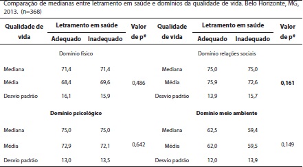 Quanto ao eixo qualidade de vida, os domínios relações sociais e meio ambiente do WHOQOL foram associados ao letramento em saúde na análise bivariada, mas não no modelo final da regressão logística. Não foram verificados estudos nacionais que avaliassem essa associação. Os resultados do estudo aqui apresentado divergiram de pesquisa canadense na qual observou-se que o letramento em saúde inadequado estava associado a pior qualidade de vida relacionada à saúde em adultos com diabetes tipo 2 (Sayah, Qiu e Johnson, 2015). A diversidade de aspectos socioeconômicos e culturais entre as populações estudadas possivelmente justificam as diferenças nos achados.
