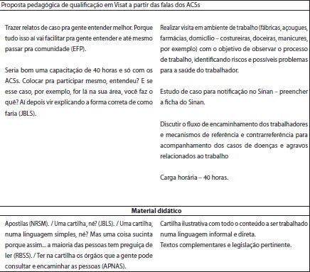 Ao discutir a qualificação em Visat e as metodologias de formação, foi possível identificar a demanda dos ACSs por capacitação e suporte técnico para o desenvolvimento de ações de Visat. No entendimento dos agentes, a capacitação em Visat objetiva qualificá-los para o desenvolvimento de ações como identificar a população trabalhadora e o perfil produtivo de sua área de atuação, situações geradoras de riscos à saúde dos trabalhadores e orientações e ações educativas. Durante a discussão no grupo focal, os sujeitos compreenderam que essa demanda poderia ser suprida por meio da implementação da proposta construída no estudo aqui apresentado, que será mostrada mais adiante. O suporte técnico para o desenvolvimento das ações de Visat demanda o efetivo envolvimento intrassetorial do Cerest e do NASF desempenhando as funções de apoio matricial, conforme pode se observar nas falas seguintes: