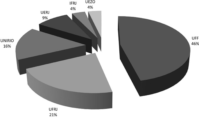 A Figura 1 mostra a distribuição da oferta do ensino em PICs entre as IES estudadas: a UFF reúne 46% do total, a UFRJ responde por 21%, a Unirio por 16%, a Uerj por 9%, enquanto o IFRJ e a Uezo respondem cada um por 4%.