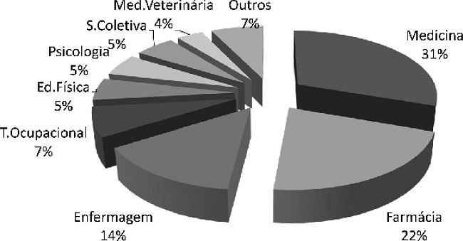 A Medicina liderou essa oferta ao responder por 31% do total. Em seguida veio a Farmácia, com 22%. A Enfermagem apareceu em 3º lugar, com 14%, seguida da Terapia Ocupacional (7%), Educação Física, Psicologia e Saúde Coletiva (cada uma com 5% da oferta) e Medicina Veterinária (4%). O item ‘outros’ na Figura 2 inclui cursos de Fonoaudiologia, Odontologia, Biomedicina e Ciências Biológicas, que juntos somaram 7% da oferta total.