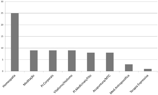 Não foram localizadas pesquisas sobre as modalidades de PICs mais demandadas pela população no Brasil. Nos EUA, estudo do National Health Interview Survey (Barnes, Bloom e Nahin, 2008) sobre as modalidades de MCA mais utilizadas pela população adulta indicou os Produtos Naturais (17,7%), a Respiração Profunda (12,7%), a Meditação (9,4%), a Quiropraxia e a Osteopatia (8,6%), as Massagens (8,3%), o Yoga (6,1%) entre outras. Estudo de Frass et al. (2012) baseado em publicações de língua inglesa e germânica na década passada, identificou a Manipulação Quiroprática, a Fitoterapia, a Massagem e a Homeopatia como as terapias de MCA mais comumente procuradas pela população em geral.