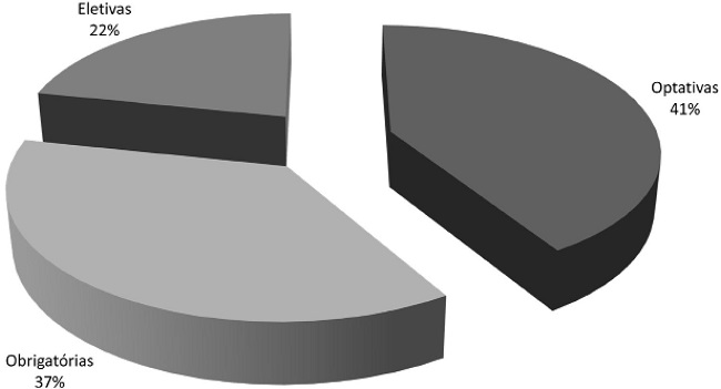 A Figura 4 mostra 17 disciplinas obrigatórias em PICs nas IES estudadas no Estado do Rio de Janeiro, o que representa 37% do total ofertado; 19 disciplinas optativas (41%) e 10 eletivas (22%). Isso significa um total de 63% das disciplinas em PICs ofertadas em formato opcional. Esclarece-se que os três cursos lato sensu específicos em PICs (dois em Homeopatia oferecido na Unirio e um em Acupuntura/MTC ofertado na UFF) não foram desmembrados em disciplinas para efeito da análise, e por isto não entraram nesse item dos resultados.