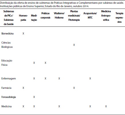 No Estado do Rio de Janeiro, o ensino das PICs se apresenta na maioria das subáreas em saúde presentes nas IES públicas, principalmente na Medicina, Farmácia e Enfermagem. Tem sido oferecido de forma predominantemente compartimentada e opcional, apoiado majoritariamente em disciplinas de abordagem teórico-conceitual e informativa. Os subtemas mais frequentes são Homeopatia, Meditação e Práticas Corporais.