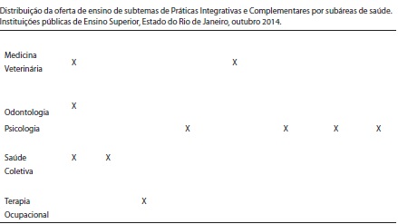 Entretanto, as experiências inovadoras que apresentam uma integração das MCA nos diversos módulos de ensino em saúde de maneira transversal, desde os primeiros anos de formação até a residência, são ainda localizadas, mesmo no cenário internacional. No Brasil, as experiências de ensino em PICs apresentam-se majoritariamente de forma compartimentada, como um anexo ao corpo central do conhecimento em saúde (Barros, Siegel e Otani, 2011; Broom e Adams, 2013 ; Christensen e Barros, 2010 ; Salles, Homo e Silva, 2014; Sousa et al., 2012 ; Teixeira e Lin, 2013 ). As experiências deste ensino no Estado do Rio de Janeiro confirmam esta tendência.