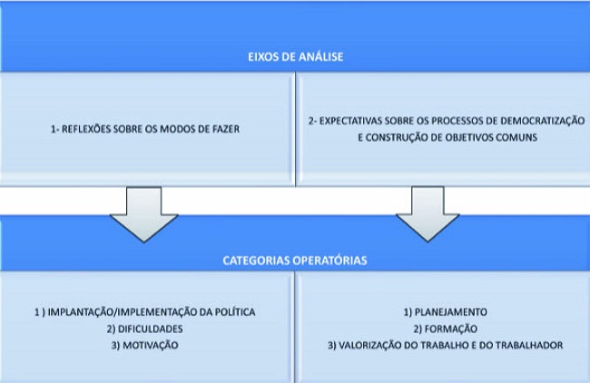 A ordenação dos dados partiu, inicialmente, dos seis eixos norteadores, os mesmos do questionário usado na entrevista. Foram construídos quadros para a consolidação das entrevistas, para a comparação dos dados e para a organização dos comentários/respostas. Na segunda etapa, tomamos como guia um modelo de matriz analítica que facilitou delinear no material a presença de dois eixos principais de análise, subdivididos em categorias operatórias interligadas e que se comunicam, em um movimento de idas e vindas.