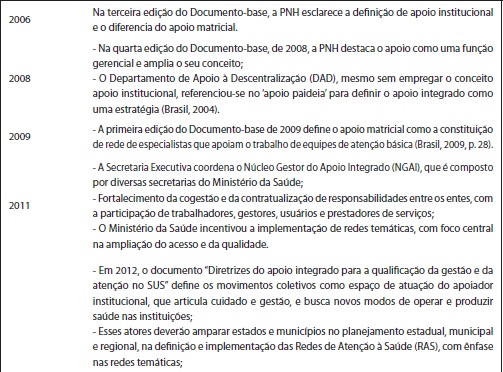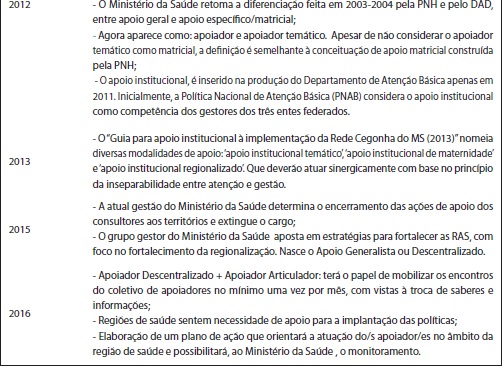 Entretanto, percebe-se que existem algumas contradições que envolvem essa função. Destaca-se, inicialmente, que a visão de grande parte dos trabalhadores sobre a PNH, por vezes, é guiada pela falta de conhecimento e de informação. Além disso, a visão que se tem acerca do papel do apoiador institucional nem sempre é clara para os trabalhadores e gestores ou nem mesmo para os próprios apoiadores. Isso ocorre, em parte, segundo o que pudemos captar nesta pesquisa, devido às constantes mudanças na nomenclatura adotada pelo Ministério da Saúde (MS). Na prática, percebe-se certa confusão entre os atores para entenderem qual o seu território de atuação e o tipo de apoiador que representa: se matricial, regional, integrado, centralizado, local, temático ou, mais recentemente, generalista. Essa configuração pode ser observada no Quadro 1 .
