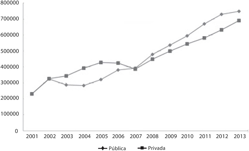 Na análise dos censos escolares entre 2001 e 2013 (Gráfico 1), foi possível observar que, em 2001, as redes públicas e privadas possuíam, basicamente, o mesmo número de matrículas (231 mil nas escolas públicas e 230 mil na rede privada). Entre os anos de 2002 e 2006, houve um crescimento das matrículas nas instituições privadas, que a partir de 2007 sofreu uma inversão com o forte aumento das matrículas no setor público, especialmente das redes estaduais e federal, que em 2011 passaram a responder por 53,5% das matrículas. A partir do censo de 2012, observou-se uma retomada de aproximação da rede privada, chegando a responder por 48% das matrículas em 2013.