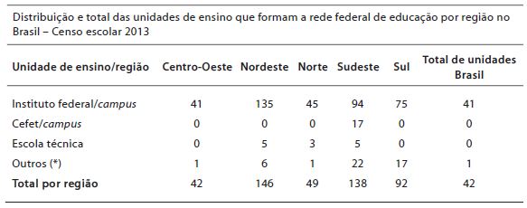As regiões Centro-Oeste, Nordeste e Norte, juntas, reuniam 50,7% das unidades da rede federal de educação profissional, enquanto o eixo Sul-Sudeste, que em 2005 respondia por 51% das 147 unidades de ensino, passou para 49,3% em 2013 (Brasil, 2014a).
