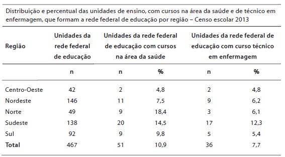 Das 467 unidades de ensino da rede federal de educação, apenas 51 (ou 10,9%) ofereciam cursos na área da saúde. Ao se considerar a distribuição dessas unidades por região, o Centro-Oeste detinha o menor percentual, com apenas 4,8% das escolas federais com cursos na área da saúde. Na extremidade oposta veio a região Norte, com 18,4% das suas instituições, seguida pela região Sudeste, com 14,5%; pela Sul, com 9,8%; e pela Nordeste, com 7,5% (Tabela 2).