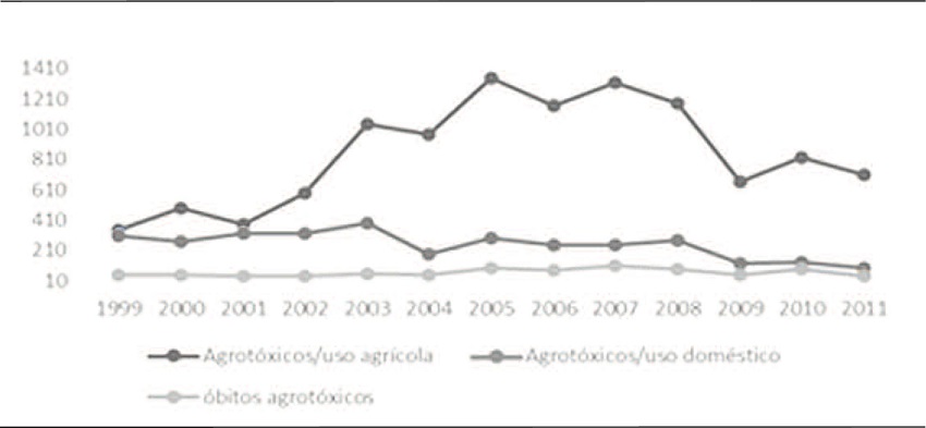 Para a sistematização do número de casos de intoxicação por agrotóxicos no Nordeste e no país, utilizamos o banco de dados do Sistema Nacional de Informações Toxicofarmacológicas (Sinitox),3 levantando o número total de casos por uso agrícola e por uso doméstico e óbitos entre os anos de 1999 e 2011, no Nordeste; além do grupo de intoxicação por agrotóxicos em geral no país no mesmo período. Foi utilizado o Excel™ 2014 na sistematização dos dados e construção dos gráficos.