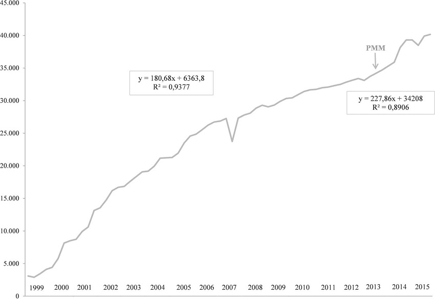 Desde a sua implantação, a Estratégia Saúde da Família tem se expandido no país expressivamente, embora com ritmos diferentes entre as regiões e os municípios com diversificados portes populacionais (Alves et al., 2014). Os dados demonstram que eram criadas, em média, 3.200 novas equipes de saúde da família por ano entre 2000 e 2005, reduzindo-se o ritmo de ampliação desde 2006. Com a implantação do PMM, ocorreu a retomada na velocidade de expansão e de incremento na cobertura da população a partir de 2013. Em 2015, passados quase dois anos da implantação do programa, houve a inclusão de mais de 15.000 médicos no SUS. Consequentemente, pelos resultados encontrados, mais de 6.000 novas equipes foram implantadas no sistema.