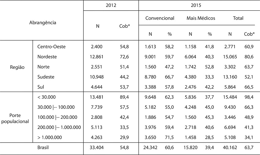 As equipes convencionais e Mais Médicos foram analisadas segundo regiões do país e porte populacional. Para as cinco regiões, a cobertura populacional da Estratégia Saúde da Família foi obtida no Departamento de Atenção Básica do Ministério da Saúde (Brasil, 2016a).
