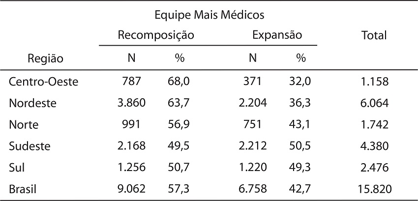 Das equipes do PMM, 57,3% substituíram equipes convencionais, já implantadas desde 2012, com maiores proporções no Centro-Oeste (68,0%) e no Nordeste (63,7%). Por sua vez, 42,7% das equipes do PMM foram responsáveis pela expansão das equipes de atenção básica no país, com maior proporção na região Sudeste, onde 50,5% das equipes no último ano estudado representavam novas equipes implantadas (Tabela 2).