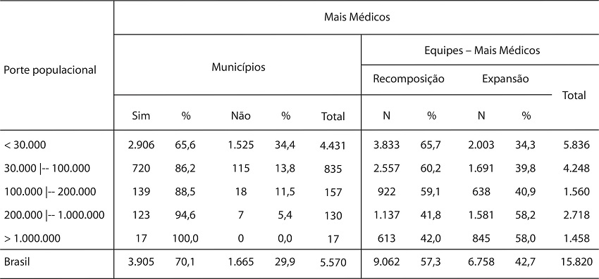 O Brasil tem implantado estratégias para assegurar a universalidade, mas até então os resultados não eram suficientes para atender às demandas da população. Em 2013, a implantação do PMM representou mais uma dessas estratégias, e passados quase dois anos representava aproximadamente 40,0% das equipes de saúde da família no país. A adesão ao programa esteve presente em praticamente 100,0% dos municípios de menor porte populacional, grande maioria da realidade brasileira.