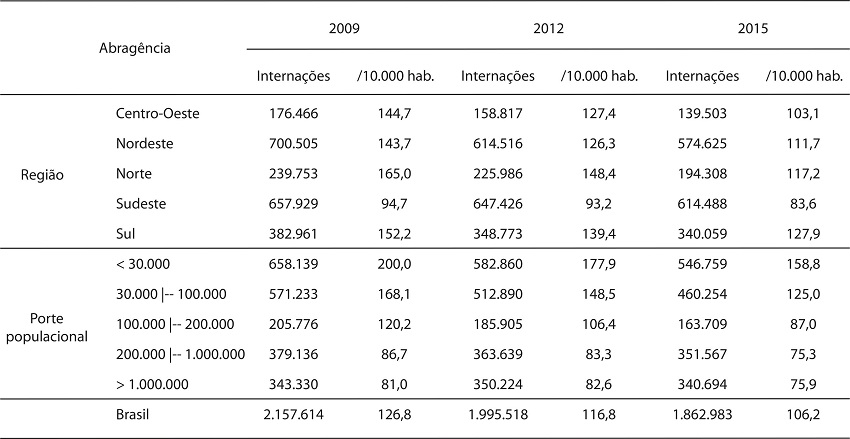 Nesse mesmo período, o maior decréscimo ocorreu nos municípios do porte III (18,2%) e entre os municípios com população entre 30.000 e 100.000 habitantes (15,8%). Quanto menor o porte populacional, durante todos os anos, maior a taxa de internações por causas sensíveis. Os municípios com menos de 30.000 habitantes concentraram quase 30,0% das internações em 2015, representando 158,8 hospitalizações para cada 10.000 habitantes nesse ano.