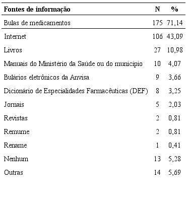 Percebeu-se, nos dados apresentados, que as bulas de medicamentos eram a principal fonte, apontadas por 71,14% dos ACSs. Em seguida, apareceram a internet e os livros, indicados respectivamente por 42,09% e 10,98% deles.