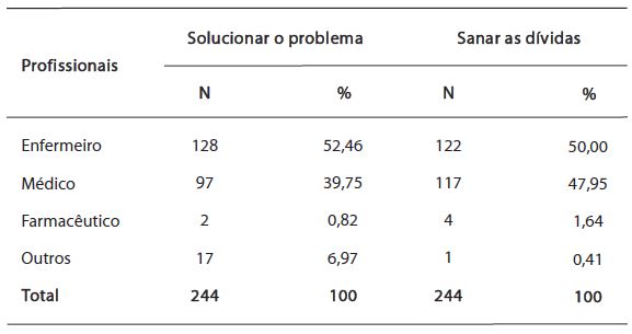 Para contornar essa situação, os ACSs recorrem aos profissionais da unidade, a fim de solucionar os problemas e sanar dúvidas sobre a farmacoterapia, conforme demonstrado na Tabela 1.