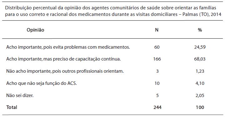 Dessa forma, a investigação 5 efetuada objetivou analisar as ações dos ACSs referentes à orientação da comunidade sobre o uso racional de medicamentos na Estratégia Saúde da Família de Palmas, capital do estado do Tocantins (TO).