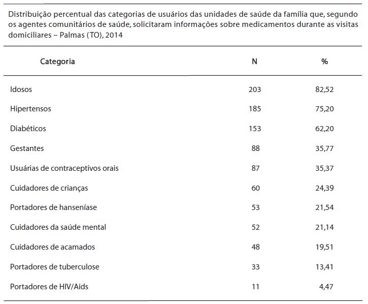 O estudo mostrou ainda as principais categorias de usuários ( Tabela 5) que solicitavam informações sobre medicamentos aos ACSs durante as visitas domiciliares.