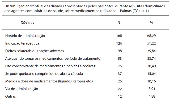Quanto às dúvidas apresentadas pelos pacientes sobre medicamentos usados, verificadas durante as visitas domiciliares pelos ACSs, observou-se que as mais frequentes foram: sobre horário de administração dos medicamentos, indicação terapêutica, efeitos colaterais ou reações adversas, duração do tratamento e uso concomitante de medicamentos e bebidas alcoólicas, conforme demonstrado na Tabela 6.