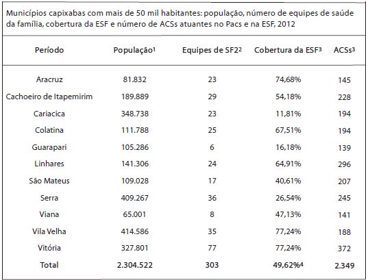GIOVANELLA, Lígia; ESCOREL, Sarah; MENDONÇA, Maria H. (coord.). Estudos de caso sobre implementação da Estratégia Saúde da Família em quatro grandes centros urbanos: Vitória. Relatório final. Brasília: Ministério da Saúde, 2009. Disponível em: <www5.ensp.fiocruz.br/biblioteca/home/exibedetalhesBiblioteca.cfm?ID=9436&tipo=B>. Acesso em 18 out. 2016.